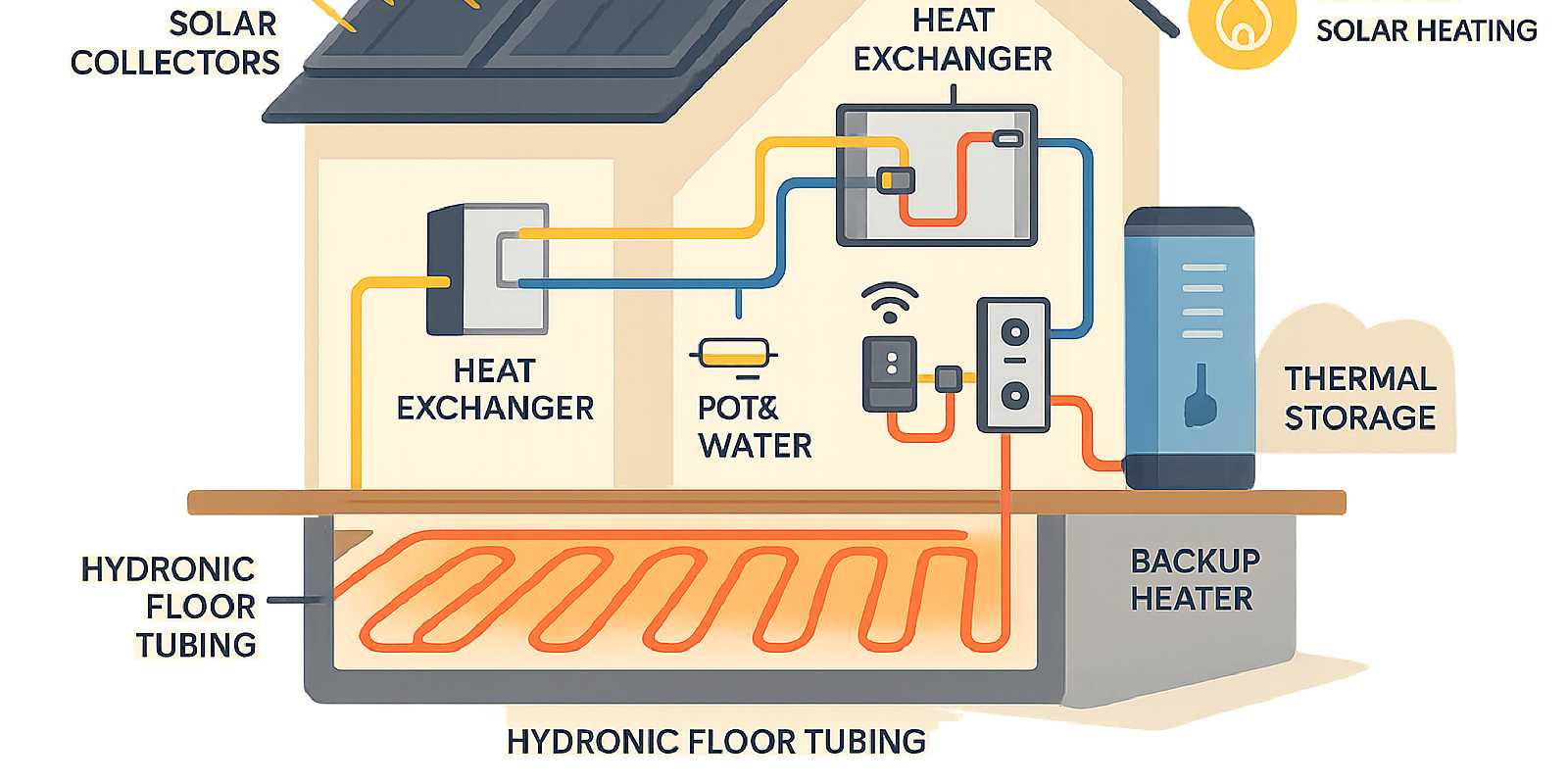 - Pump and controls: Circulates fluid when collector temperature exceeds tank temperature; zone valves direct heat to different rooms.